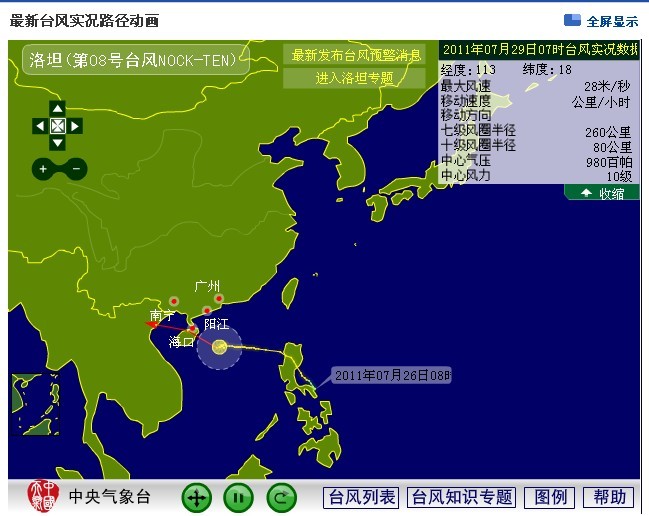 今年第8号强热带风暴“洛坦”的中心29日10时位于海南省文昌市东南方大约190公里的南海北部海面上,就是北纬18.5度、东经112.2度,中心附近最大风力10级(28米/秒),中心最低气压980百帕。