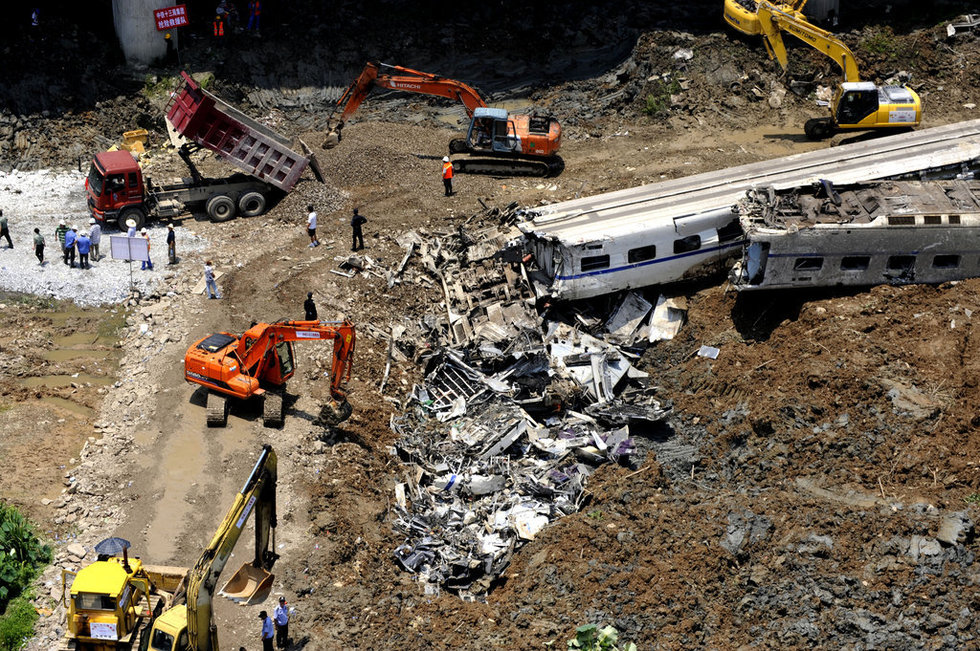 最令人不可思议的是指挥方的现场处理,竟然在光天化日之下,用重型工具砸碎车头,挖坑掩埋,其后又要用吊车将桥上残留的事故车厢吊下。拜托,地震救援也有黄金72小时一说,此时距离事发还不到24小时,就能擅自宣布没有生命迹象,然后动用铲车、切割机毁坏车厢?就算是眼睛看不到生命,但还有那些失踪人口是不是要再找找?再退一步说,就算是全都死光光了,那些留在车厢内的遗体,也应该留点尊严吧。就算是日本人,面对汶川地震救援挖出来的遗体,不也集体鞠了个躬么?