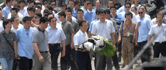 温家宝总理:应该看到改革开放30多年来,中国的发展,取得了很大的进步,我们懂得一个国家要真正繁荣和强大,要依靠科技,提高全民族的素质。如果说我们今天站在这里来总结这起事故的教训,对得起这起事故中死难的人们,那就是我们全国人民,我们整个民族要振奋精神,团结一致,更加努力的学习和工作。