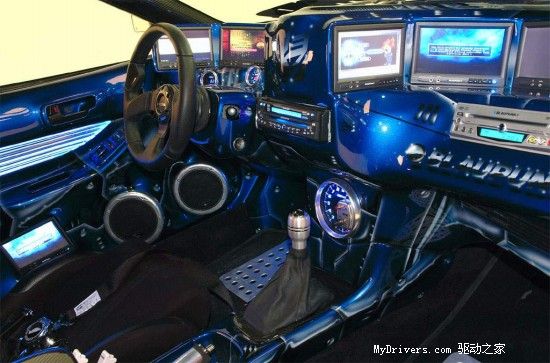先不提那些BT的发动机、车身和轮胎的改装,这辆由本田1994款 Acura Integra LS改装而成的车内安装了数个DVD播放机, TravelPilot导航系统,美国SIRIUS卫星广播接收器和PS2游戏机等等,最强的是车身后部还藏着个变形金刚。引用Engadget的话说,这车就差地对地导弹了,而我要说,这车就差能变形了。国外改装车Fans的资金和动手能力都很BT啊!