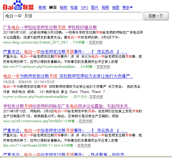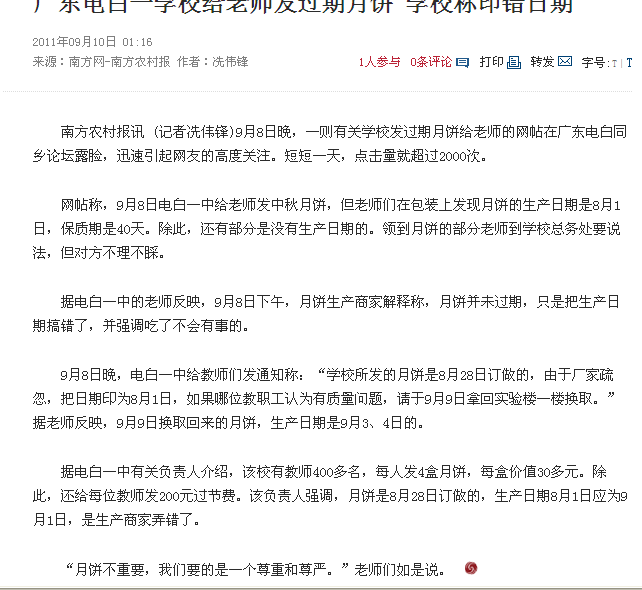 电海中学发的也是金龙泉的月饼,有些好象也是没有生产日期的,不过学校已及时给全体教师发来信息信誓旦旦说,这些月饼绝对没有问题,如怀疑有质量问题可立刻去换,看来我们的领导是高度重视啊!非常感谢!