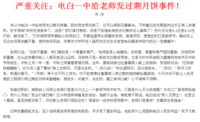 电白一中问题月饼已引起关注,希望一中领导能以人为本,妥善处理此事。否则,问题会越来越严重。