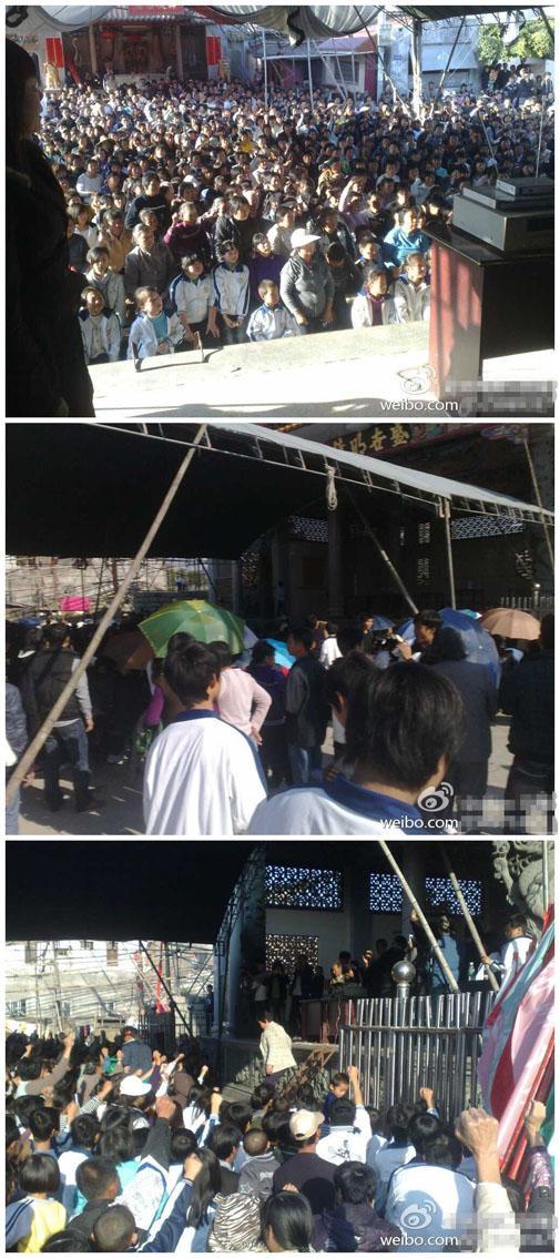 12日下午,陆丰乌坎村村民举行村民大会。期间村民高喊:还我土地、打倒贪官、清腐反贪、人人有责、血债血还。(微博图片)