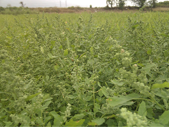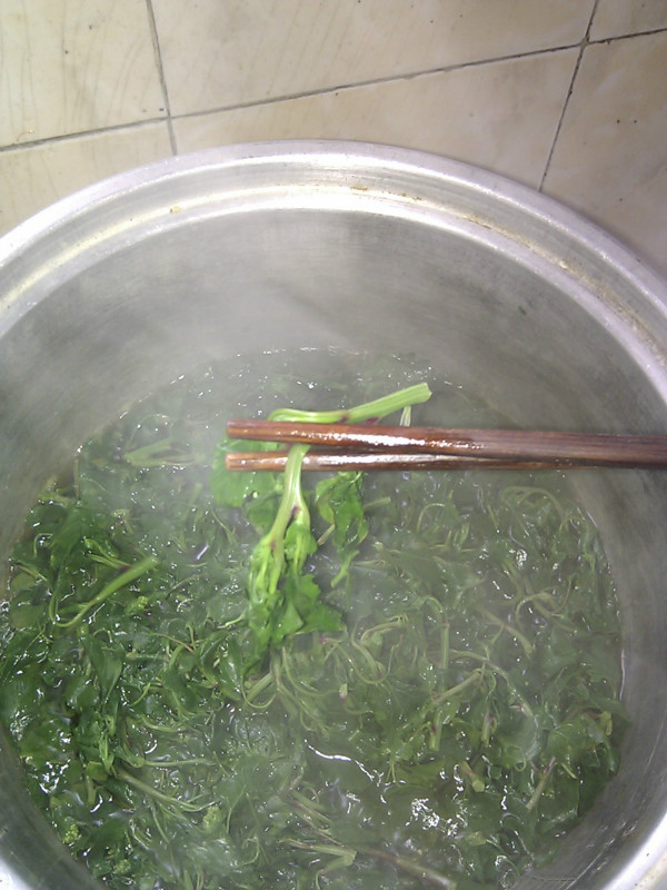 估计很多小时候在田里长大的人都有吃过这种野菜,到现在那个味道还是独特地让人回味无穷,所以决定再下一趟田,动手做一回吃一回。因为伸手去摘的时候手上会粘有许多绿白色如盐的粉末,所以顾名思义本地人都叫它作盐子菜,其他地方就不得而知了。虽说它是菜,但它又是田间一种长势比较疯狂的野草,春天一到就遍布得到处都是,特别喜欢在番薯和花生这类作物的地里搞破坏,下雨了便是茫茫一片农民看着它只能暗暗叫苦。小时候就经常吃到,就因为家里种的番薯和花生多,拔出来的盐子菜可以堆成山了,害我们累一天的东西我们当然是恨啊。于是洗干净锅,挑那些最嫩最好的做送粥的菜。呵呵,其实说是恨它才吃是开玩笑的,吃起来的时候那还记得什么恨,大口大口地浑然陶醉那种特别的味道――软软的,夹带着花生油和蒜子的味道,一股独特的清香在舌头上翻滚。