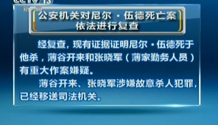 2012年4月10日,公安机关对尼尔・海伍德(官方通报中的译名为“尼尔・伍德”)死亡案进行复查。官方称有证据证明海伍德死于他杀,薄熙来妻子薄谷开来和薄家勤务人员张晓军有重大作案嫌疑,二人涉嫌故意杀人犯罪,已被移送司法机关处理。同时中央也决定对薄熙来进行停职处理并对其“严重违纪问题”进行立案调查。