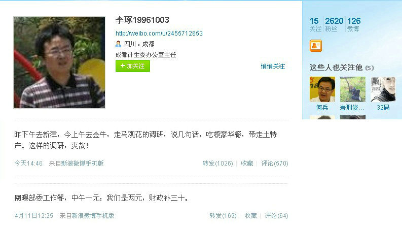 “李琢”的微博以“记录,发现”四个字开通于2011年11月11日,经过三次更改后,名字定格为“李琢19961003”,个人简介则在今年4月5日才改为“成都市计生委办公室主任”,并上传了一个戴着眼镜的中年公务员的照片形象。在4月12日晚走红前,微博的声音一直很微弱――转发数和评论数都是零。