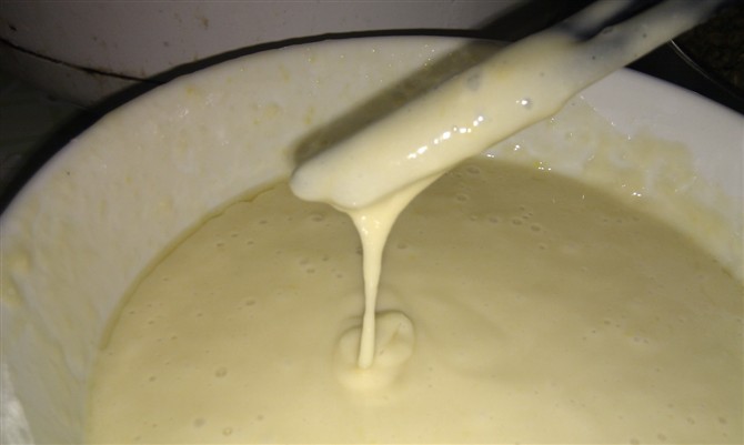 开始操作的时候先把自发粉倒在大碗里――――然后把适量的白糖倒进去(根据个人口味添加)――――用筷子搅匀――――再把鸡蛋敲下去――――用筷子搅,搅的过程中加入牛奶或清水――――继续搅(搅的过程中要适量地加进牛奶或者水,但不能一下子加太多,加水是必须控制好的)――――再搅(5分钟或者更长,因为必须将自发粉完全变成浆)―――休息一下――――再搅(有人无耐烦了)――――好了,不搅了,用筷子捞一下如果浆成条状往下流就大功告成了