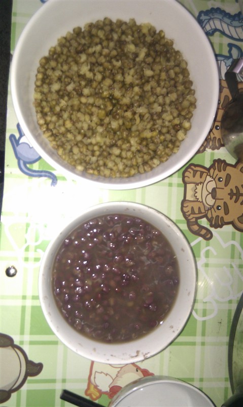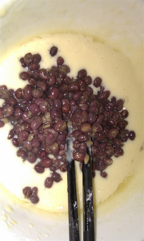 因为早上已经用高压锅压好了红豆和绿豆,所以今天做的蛋糕是红豆味和绿豆味的。