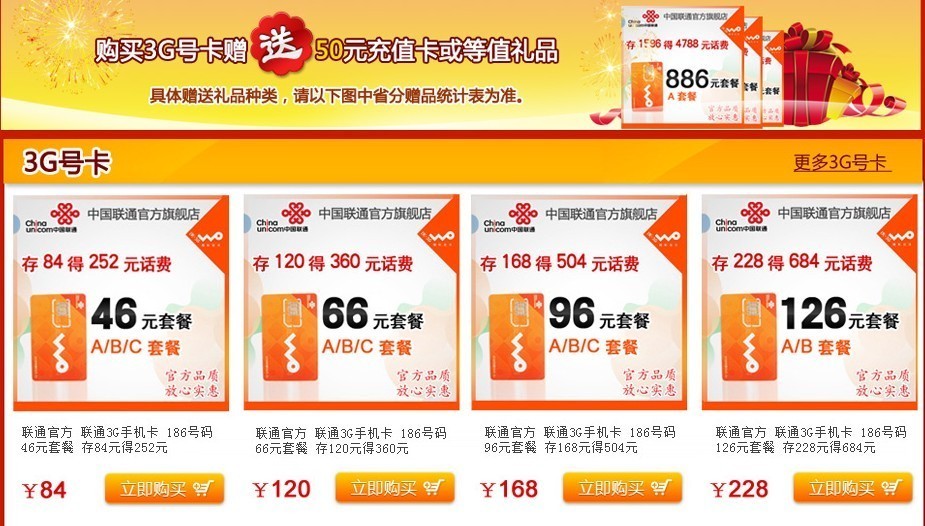 中国联通淘宝官方旗舰店开业大酬宾,3G手机0元购,充值卡免费拿!