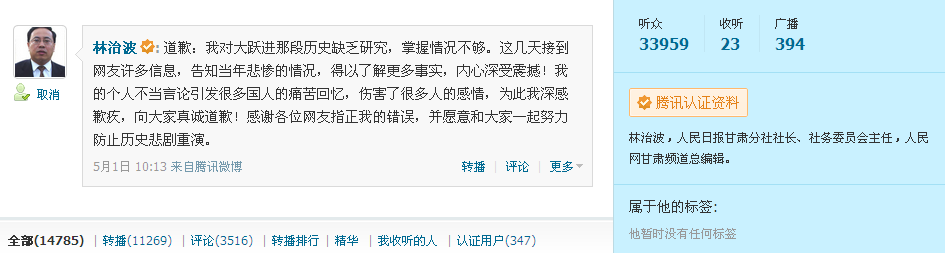 近日人民日报甘肃分社社长林治波发微博说“有人为了糟蹋毛主席,竟然夸张污蔑1960年―1962年饿死几千万”,并声称“有人走访当年饥荒最严重的安徽河南农村,当地百姓只是听说饿死人,并未见过”。此语一出,舆论哗然,随后林在微博上针对此事道歉。[详细]