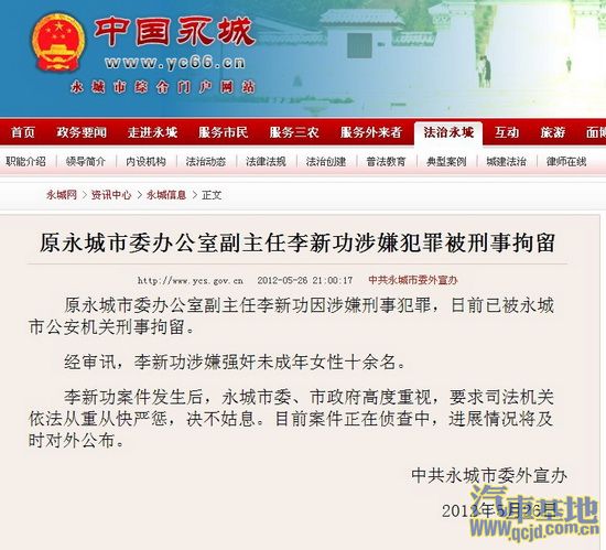 原永城市委办公室副主任李新功因涉嫌刑事犯罪,日前已被刑事拘留。经审讯,李新功涉嫌强奸未成年女性十余名。有消息称,李新功是在5月8日在永城市第三中学门口作案时,被刑警现场抓获。当地市委、市政府表态:“绝不姑息”。 http://url.cn/3CJGIb
