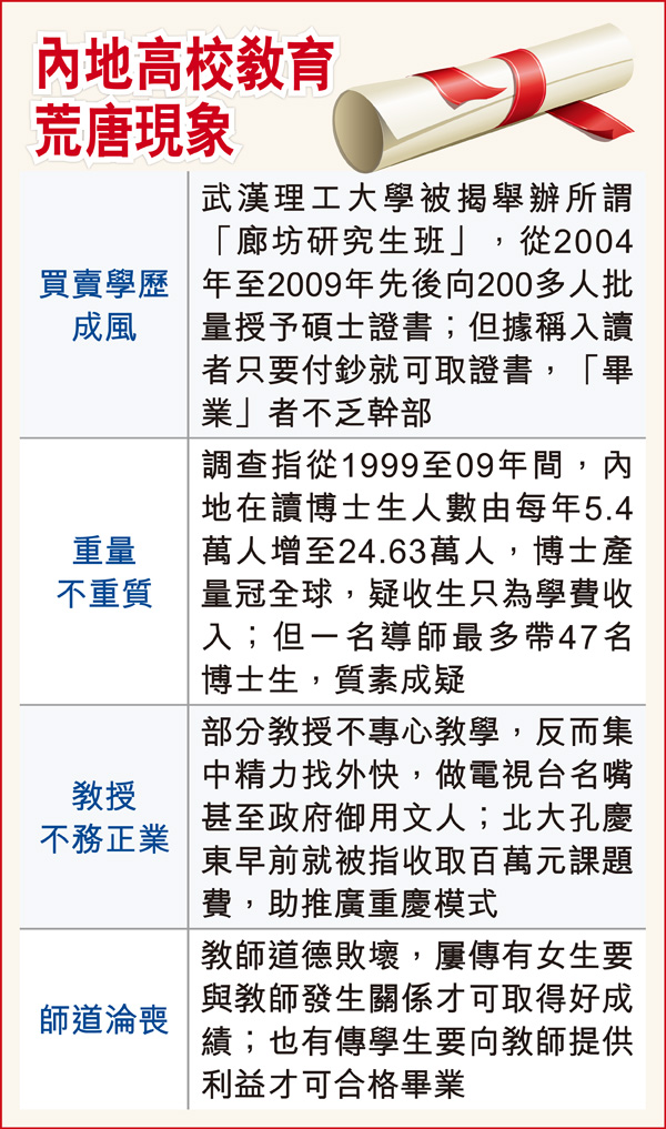 事实上,有分析认为,内地近年连环爆出高校丑闻,令不少民众对国内高校的信心危机白热化;其中部分院校买卖学历成风,学历认受性低,例如武汉理工大学早前被揭近年向200多人"出售"硕士证书,购买者不乏干部;而部分教授更师道沦丧,女学生要透过与男教师的特殊关系、又或向教师赠以金钱财物,才可取得好成绩。