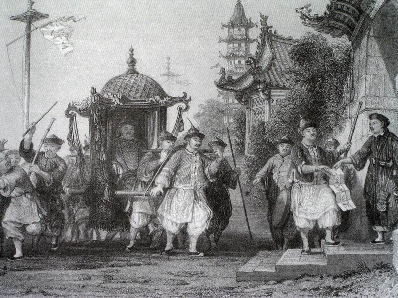 乾隆以来人口过剩,中国苦力的价格实在便宜。到处是多余的劳力,帮人抬轿,仰人鼻息,没有什么尊严。清朝官员出行,雇佣大量苦力,前呼后拥,在街上吆喝扰民。情况如画面描述的这样:前面有人鸣锣开道,两旁有人驱赶围观百姓,防止有人拦行告状,随行还有总管,那位在画面中走在前面,登门递上名帖,通报主人姓名的人。官员们喜欢这顶轿子,已经超过了它的交通工具的功能。有资格坐一顶官轿,为皇上办事,在街上吆五喝六,是社会身份地位的标志。