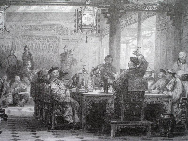 1693年,英国国王曾经请一位在欧洲访问的来自南京的中国耶酥会士沈福宗,到自己的宫廷表演中国的餐桌礼仪,观察中国人如何使用筷子,如何布置餐桌,如何使用成套的瓷器。英国使节和商人们来到清国,在各地受到总督、巡抚们的招待。丰盛的宴席让他们对中国饮食有了体验。有机会见识正宗的中国宴席,他们做了详细的记录:官吏的住宅比起普通人家的房子,就像艺术家的工作室。这些人因为知识特权受到公众的尊重。他们厅堂里陈列着小饰件,也同时表明他们生活的高质量。餐厅里的家具和其他房间里的一样,都非常值钱,精美异常。墙上和天花板上总是调梁画栋,装饰着美丽的图案,还悬挂着许多漂亮的彩纸饰物。桌子的四脚都经过雕刻。中间放着花瓶,有瓷的、玻璃的、银制的,里面盛装着鲜花和香料。花瓶四周的桌面留给尊贵的客人置放餐具。在亚洲其他地方很少使用的椅子中国家庭普遍使用。主人总是坐在餐桌的一端,他的位置要用一只矮垫子,垫得比其他客人的位置高一些,而不象欧洲那样,主人随便坐在客人中间。