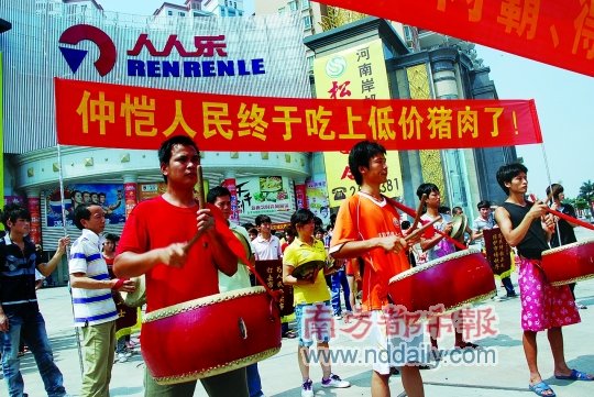陈江肉联厂被查,百余肉贩、餐馆老板敲锣打鼓庆贺。南都记者摄