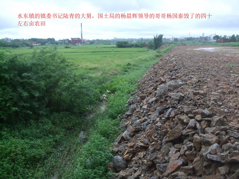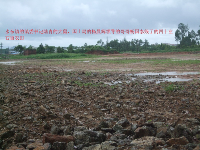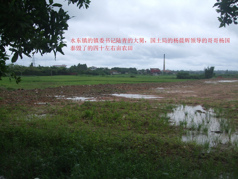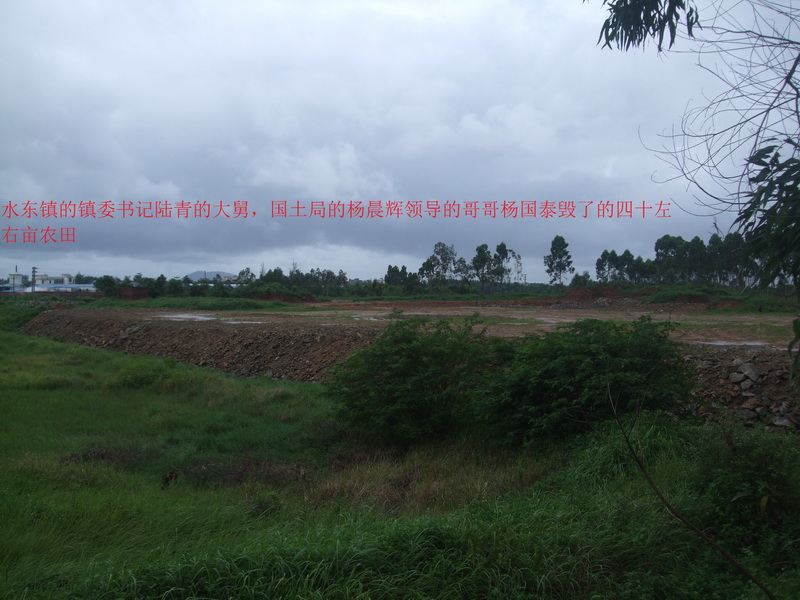 在325国道的广湛加油站对面有一片农田,水东镇的镇委书记陆青的大舅,国土局的杨晨辉领导的 哥杨国泰老板买了,四十左右亩农田囤积土地做开发区,由于该农田距离325国道有落差有2米高,于是杨国泰老板在在旁边的坡地推土来填埋低洼的农田,开始吴建中派负责国土监察的去阻止杨国泰的毁田行为,在杨国泰的妹夫水东镇镇委书记陆青的牵针引线下给吴建中书记送了20万元。杨国泰在国土局的当股长的弟弟杨晨辉的指导下,叫杨国泰每天晚上和星期六和星期日没有人上班的时候,叫钩机、推土机、泥头车开工填土毁田这样才不影响。就这样经过半年偷偷摸摸的工作终于填平了这些农田。就这样一片良田就给这些贪官毁了。