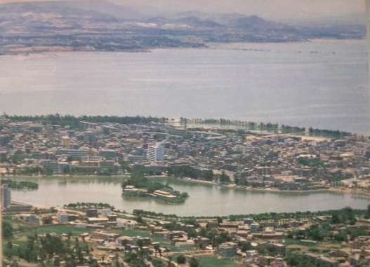 这个看起来是西湖・・然后下面是海堤・・・然后顺着就找到中心台了再顺着东阳北街跟东阳南街之间・看到一个挺高的建筑・不知道是不是戏院・・印象中好像没有那么高的楼呢・也可能是粮食局・最右边的应该是文化宫和现在的文化局吧・・我是80后・・哎呀・真的老啦・・