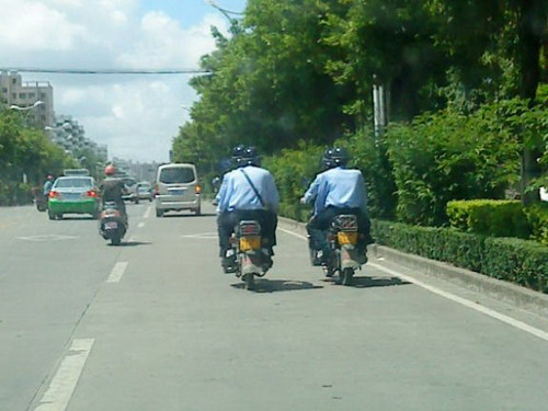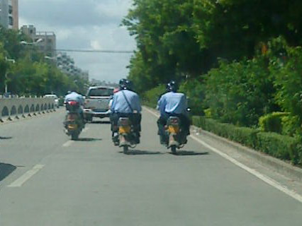 说真的,他们那些治安巡逻铁骑因何因暂时还不上牌我不关心,俺只关心为何他们驾摩托也不戴头盔确可大摇大摆在公路上行驶,而我们老百姓驾摩托有时忘了戴头盔驾车被逮住却要罚一两佰大圆????"我也知驾摩托戴头盔对大家都有好处"