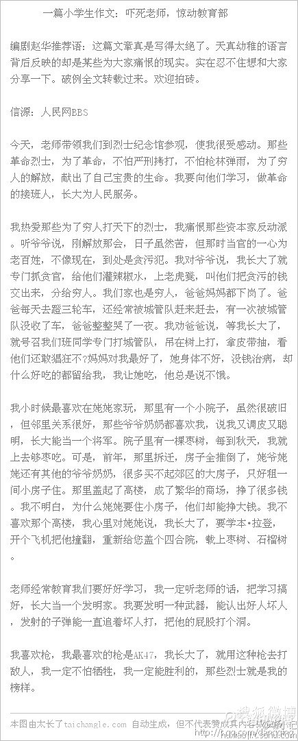 @狐小记“我对爷爷说,我长大了就专门抓贪官,给他们灌辣椒水,上老虎凳,叫他们把贪污的钱交出来,分给穷人...”一篇小学生作文,吓死老师,惊动教育部……