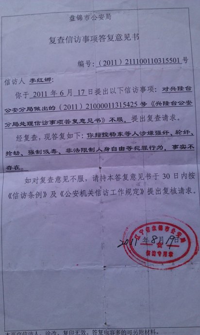 3月14日在我强烈要求下市局信访重新补从的信访答复却变成:所有指控是证据不足.为何堂堂国家严肃的执法机关说话可以朝令夕改(其实我们自己收集的证据足够可以立案,而向专案组提供却不受理,我和未婚夫及几多名好友多次向专案组和法控科反映51号监控视频在2011年3月底前都还没有丢失,请他们及时去提取,而他们却推三阻四无人去提取,无奈之下只有自己买台摄像机拍下不能正常提取的楼道监控视频,而韩冬斌等警官却说此视频无法正常提取是技术失误,为此我们有足够证据和证人证实此无法正常提取的视频是人为的。因为我们请来帮忙的是专业人员和律师的提醒)而辽河康乐宫监控视频因韩东斌等警察未能及时提取已导致丢失。3月22日去人大上访并交了不知道是第几封举报信了、23日去市委监察室交举报信也不知道是第几份了(这之前有市委孙书记和人大张主任及政协刘主席关心过此案并责成检察院刘铁英和付凯监督。而办案人却欺上瞒下,视国家法律为儿戏,完全违背中央倡导的依法治国的精神,可以想象凶手的势力何其之大,某些执法人员为包庇黑恶势力不惜以身试法!情愿充当其保护伞,道德泯灭,天良尽失)案发至今此案无任何结果。专案组推托证据丢失。对我们自己提供的DAN解释模糊不清,推说没有可比对的嫌疑人。办案双方对责任相互推脱。主管局长麻中庭不闻不问并威胁说:再上访就拘留我们,吓得我们现在都不敢再访。这期间我给省委,省政府,市委,市政府,公安厅,公安部及中纪委和高检等部门主要领导写过无数次信,可此案至今还是悬而未决!现恳请天下好心人和正义人士及各位网友互相转发此文,希望引起全社会关注此案,强烈谴责盘锦市公安局兴隆分局个别办案人包庇凶手!同时感谢大多数有正义感的好心警官!有证据,可是告不了他们,难道只有到省政府门前自焚才能引起引起关注吗?
