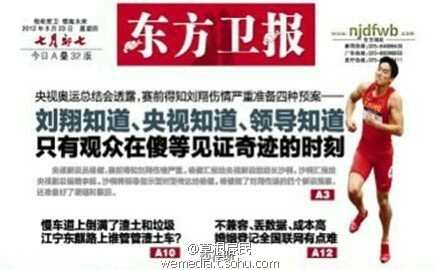 【三个“知道” 】东方卫报今日头版V5!刘翔知道,央视知道,领导知道――只有观众在傻等见证奇迹的时刻。
