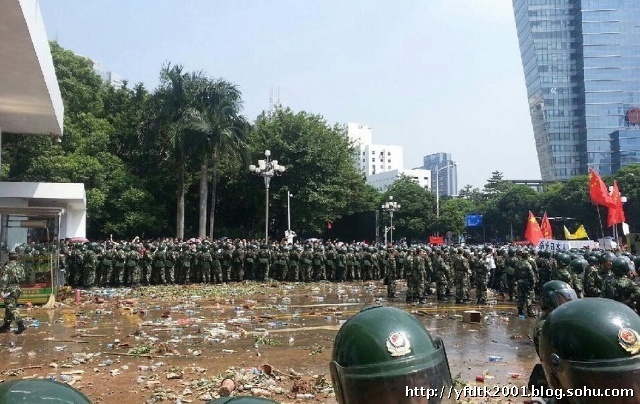报导说,示威者下午转到深圳市政府外,要求释放上午被带走的示威者,有人攻击市委大楼,随后有人向公安人员掷石,深圳警察以棍追打、以催泪弹和水炮驱赶示威者,场面混乱,有人受伤挂彩。