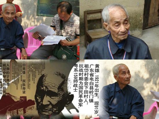黄雄,男 ,1921年出生,现91岁,广东省电白县岭门镇祖岱村委会下田村人,抗战时期为国民革命军 粤系159师战士。