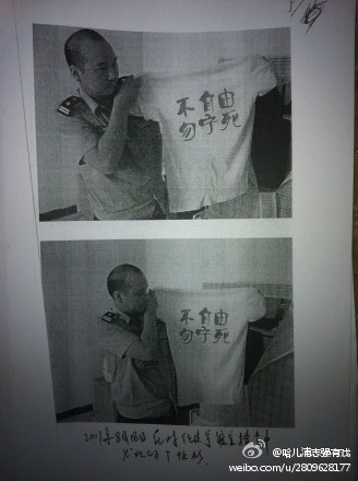 任建宇在重庆市涪陵劳教所。任建宇曾经让女友帮他在网上订购一件印有“不自由,毋宁死”字样的文化衫。这件衣服后来被警方作为物证收走了。