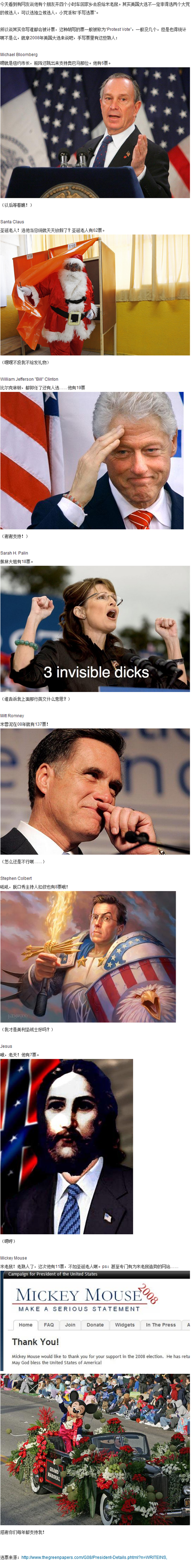 【美国大选八卦:你猜米老鼠得了多少票?】美国大选不一定非得选两大党候选人,还可以“手写选票”。但胡写的选票也得统计不是。于是,就会出现一些好玩的局面。例如,2008年米老鼠在全美国获得了11张选票,圣诞老人更霸气,狂扫62票!来看看哪些人被投票了吧。(@果壳网 )