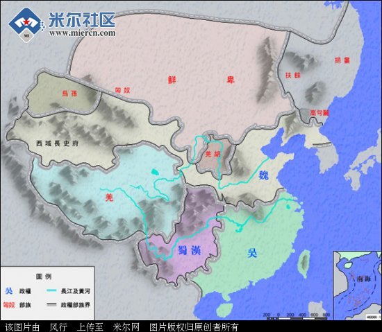 (吴:260万平方公里,浙江,江西,福建,广东,海南,广西和越南北方。)