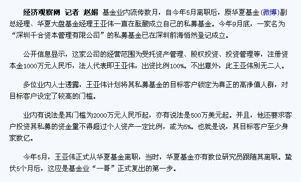基于乐叔在论坛的影响力,乐叔发的这个贴如果确是传销网站的话,可能上当的同乡不会少,所以,我搜集一些信息如下,望各位老乡明辨: 1。可能是网络传销的例子:安泰卓越 贴吧网址: http://tieba.baidu.com/f?kw=%B0%B2%CC%A9%D...%BD%B4%F0%D2%C9 2。“网贷之家”论坛对上面“千叶资本”的质疑: http://58.215.190.32/forum.php?mod=viewthr...&extra=page%3D1 3。人民网里关于王亚伟及其“千叶资本”的资讯,资讯显示此投资是专为富人而设的: http://finance.people.com.cn/n/2012/1018/c...6-19307161.html 4。我个人感觉比较靠谱的真实“千叶资本”: http://simu.howbuy.com/qianheziben/