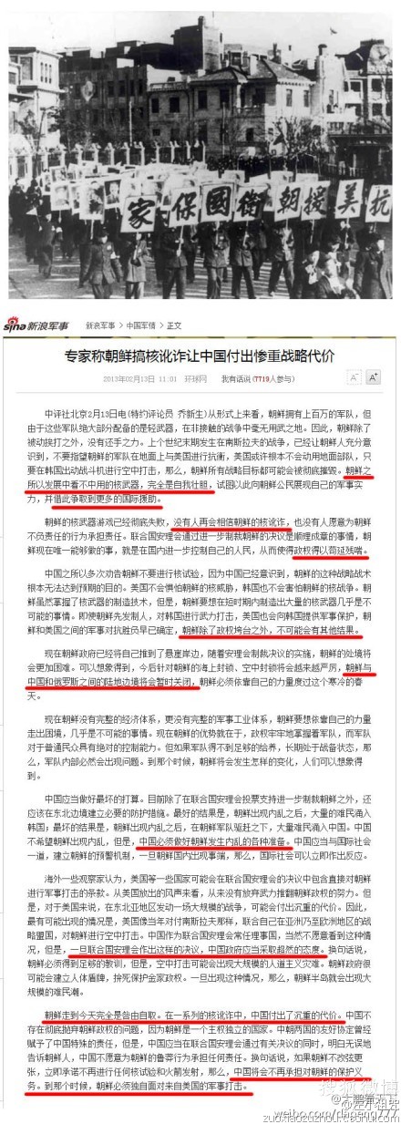 2月13日,环球、中华、新浪等各大网媒均转发了香港中评社文章《朝鲜搞核讹诈让中国付出惨重战略代价》:第一,中国损失重大;第二,朝鲜根本不是美韩对手;第三,中国已做好朝鲜军国主义政权被颠覆的准备;第四,美国一旦攻朝,中国将旁观。http://t.cn/zYJ2OzM