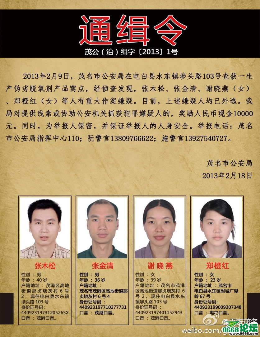 2013年2月9日,茂名市公安局在电白县水东镇锻仿103号查获一生产伪劣脱氧剂产品窝点,经侦查发现,张木松、张金清、谢晓燕(女)、郑橙红(女)等人有重大作案嫌疑。目前,上述嫌疑人均已外逃。我局对提供线索或协助公安机关抓获犯罪嫌疑人的,奖励人民币现金10000元。