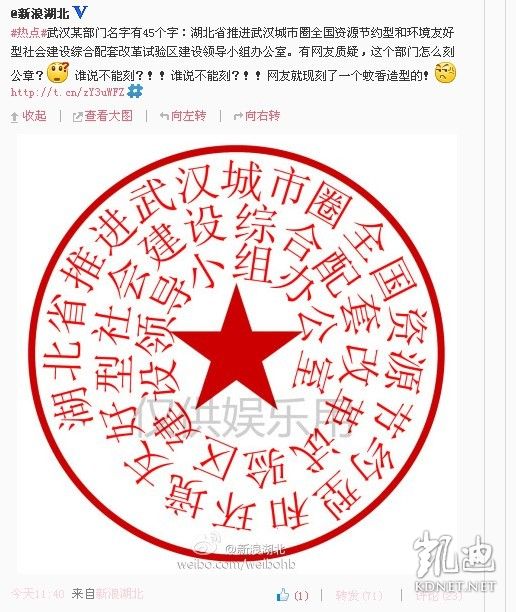 “据说是全国名字最长的部门:‘湖北省推进武汉城市圈全国资源节约型和环境友好型社会建设综合配套改革试验区建设领导小组办公室’。”微博网友“释迦摩驴”提供了这样的“雷人”信息。