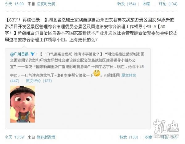 大部分的网民担心,过长的机构名称会影响以后的工作。从事媒体工作的网民“mellit”表示不解:“大家以后写标题,光机构名就要21个字么?名片好印吗?节约纸张吗?以后介绍出席领导,光是念头衔就要花很多时间吧?”