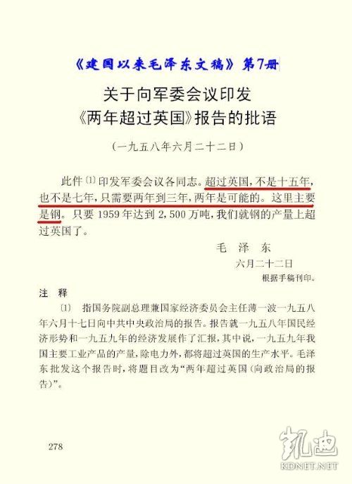 下图是毛泽东关于二.三年内钢铁产量赶超英国手稿刊印件