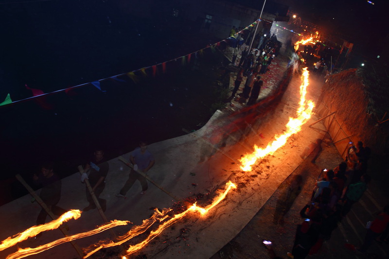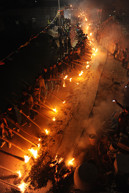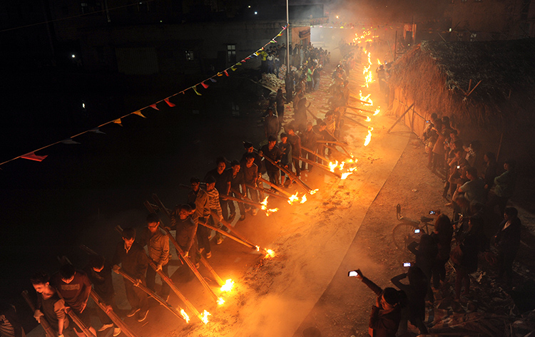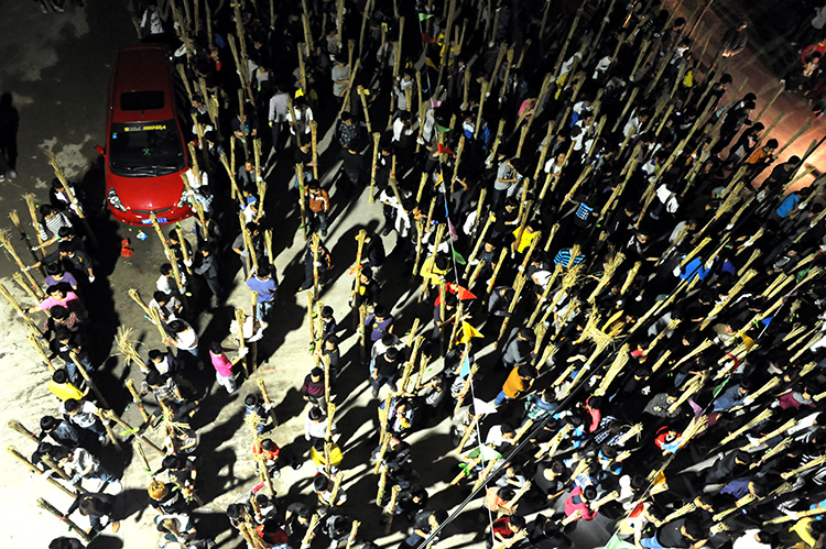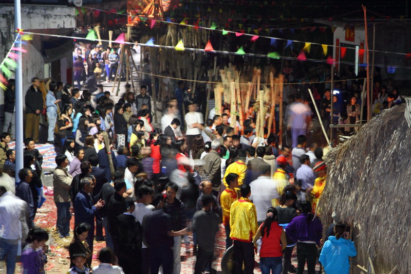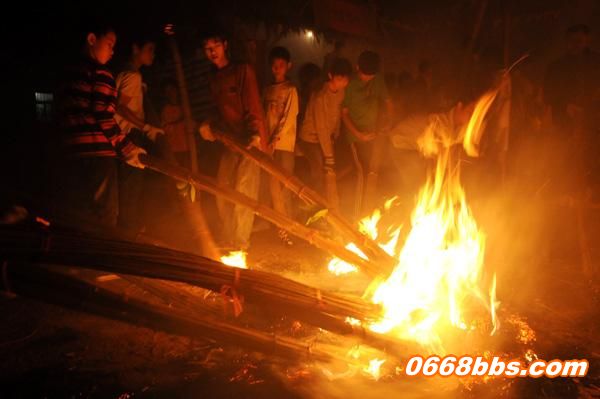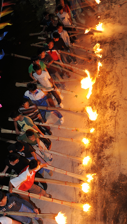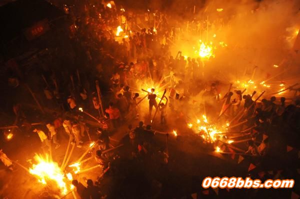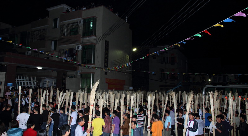 3月19日晚上至20日凌晨2点,电白县水东彭村的一块空地上,聚集了该村数百名青少年男子,他们人手握着一把捆成棒状的细竹篾,围着数堆烧得正旺的柴火,等待点燃火把。晚上12时,随着几声锣响和一阵阵鞭炮声响起,活动正式开始,现场的男女老少齐声呐喊,青少年男子一齐点燃火把,他们一边高声呐喊,一边举着火把,排着队沿着村中的一口鱼塘边鱼贯前行,长长的“火龙”向村中游去。数百支熊熊的火把组成的“火龙”沿既定的路线列队前进,穿过村道屋巷、走过田野,一条绚丽的“火龙”在夜色中逶迤穿行,蔚为壮观。据了解,游火龙这个传统风俗在彭村已有400多年的历史,以前只有建新房、娶媳妇、添丁的人家才有资格参加游火龙,称作‘参(三的意思)花’,现在很多年轻人都参加了。最初“游火龙”是用来驱邪的,现在变成了村民年例的狂欢节目。