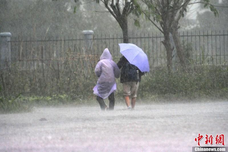 海南琼海遭遇暴雨 行人车辆水中“游”行 :3月29日上午,海南琼海市区电闪雷鸣,暴雨倾盆,3小时里降雨42.8毫米,并出现瞬间达到8级的强风,一些街道积水严重。图为海南琼海城区行人在大水中穿行。