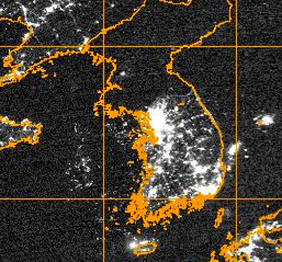 金三强大夜晚漆黑一片,南韩邪恶晚间灯火通明,盲人都会看到滴。