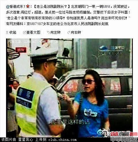 在北京朝阳门一辆MINI。此车无牌,无证。在马路上多次违章。闯红灯,超速。差点把一位正在过马路的老奶奶撞倒。有网友爆料,车牌“京M87187”车主的老公是北京市人民法院副院长赵航。被交警拦下后对记者、交警大呼小叫。气焰极其嚣张!女子叫嚣道:“你知道我男人是谁吗?说出来吓死你们!