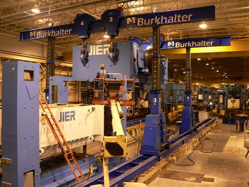 据济南二机床副总经理张世顺介绍,福特汽车公司美国项目包括集团公司接连承接的福特汽车公司美国本部两个工厂五条大型快速送料冲压生产线订单,其中,一期项目位于堪萨斯,是一条双臂全自动快速冲压线。该生产线由4台多连杆压力机组成,总吨位6100吨,由双臂送料系统、拆垛机、清洗机、涂油机等设备组成,应用多连杆、数控液压拉伸垫、同步控制、全自动换模、整线防护等多项关键技术,生产节拍15次/分,是普通自动线的2-3倍;全自动换模时间3分钟,是普通自动线的三分之一,是目前世界最先进水平的冲压生产线。