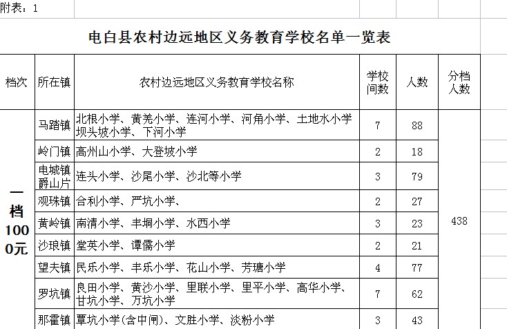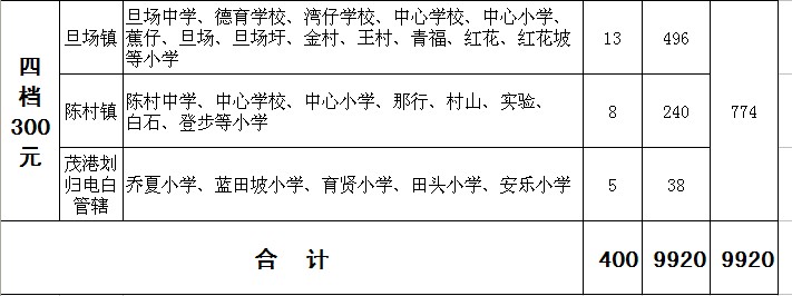 4、第四档:旦场镇部分中、小学;陈村镇(除森高、彭村、寨头、镇东等小学外)所有中、小学和茂港划归电白管辖的乔夏、田头、蓝田坡、育贤、安乐等5间农村小学;发放教师岗位津贴标准每人每月300元。