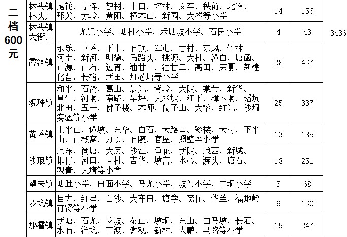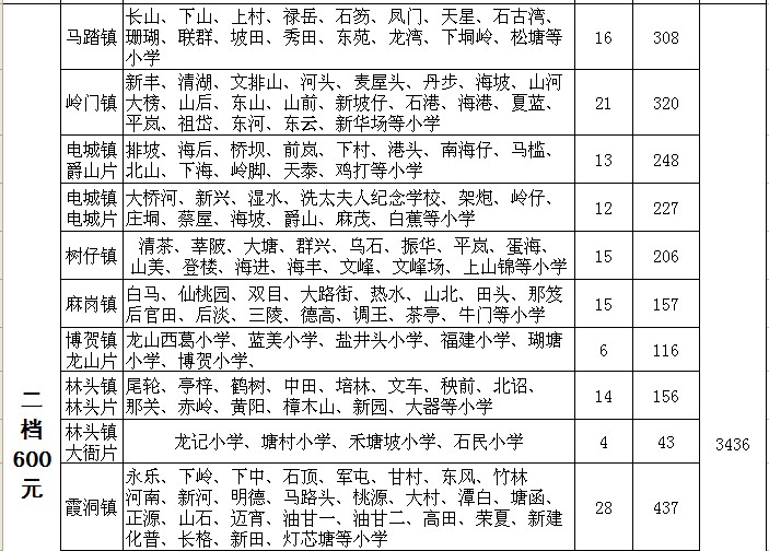 2.第二档:马踏、岭门、爵山、霞洞、观珠、黄岭、沙琅、望夫、罗坑、那霍等10个镇(除第一档33所农村小学外)的农村小学;电城、树仔、麻岗、龙山、林头、大衙等镇部分农村小学。发放教师岗位津贴标准每人每月600元。