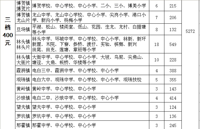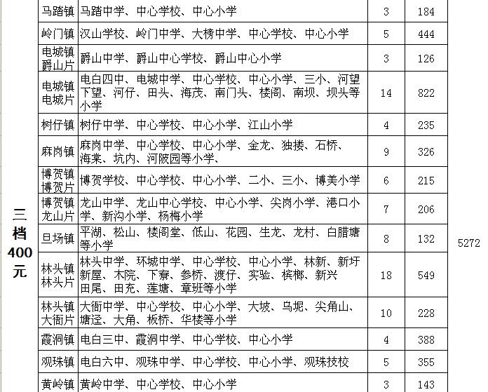 3.第三档:马踏、岭门、爵山、电城、树仔、麻岗、龙山、林头、大衙、霞洞、观珠、黄岭、沙琅、望夫、罗坑、那霍等镇所在的中学、中心学校、中心小学;博贺镇(不含龙山片)所有学校;电城、树仔、麻岗、龙山、旦场、林头、大衙等镇部分农村小学。发放教师岗位津贴标准每人每月400元。
