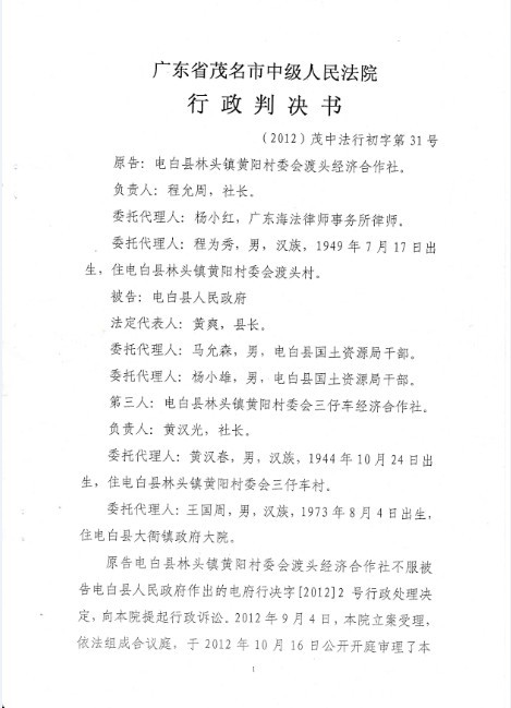 从2011年9月份开始至今,三年来,每年都被林头镇渡头村的恶霸借土地纠纷之名,多次组织几十人走上门来打砸、砍树、毁坏生产、打人,我家前后已有4人被多次打伤。如果真的是霸占他们土地,可以通过司法途径解决。但是事实上经县政府、市政府、市中院(判决书为:2012茂中法行初字第31号)都深入到现场调查取证,做出一致确权决定,已非常清楚确认为我家合法土地。可他们目无国法,在毫无法律、事实依据情况下,与某些人蓄意谋划,采用极端、野蛮手段来闹事。仗着人多对我家硬抢,经常几十人围攻我家闹事、砍树,毁坏财物、农作物,我家去制止就打人,无法无天。每次他们一来,我们都报警,可公安人员来了,也奈何不了他们。有一次,我儿子去制止,受到他们围攻殴打,晕倒在血泊中,最后住了一个多星期医院。经法医鉴定为轻伤,现在还不能干重活,有时还头晕头痛。更令人费解的是,电白县林头镇派出所竟然跟不法分子作验伤证明,把我儿子定为犯罪嫌疑人,拘留并罚款处理。