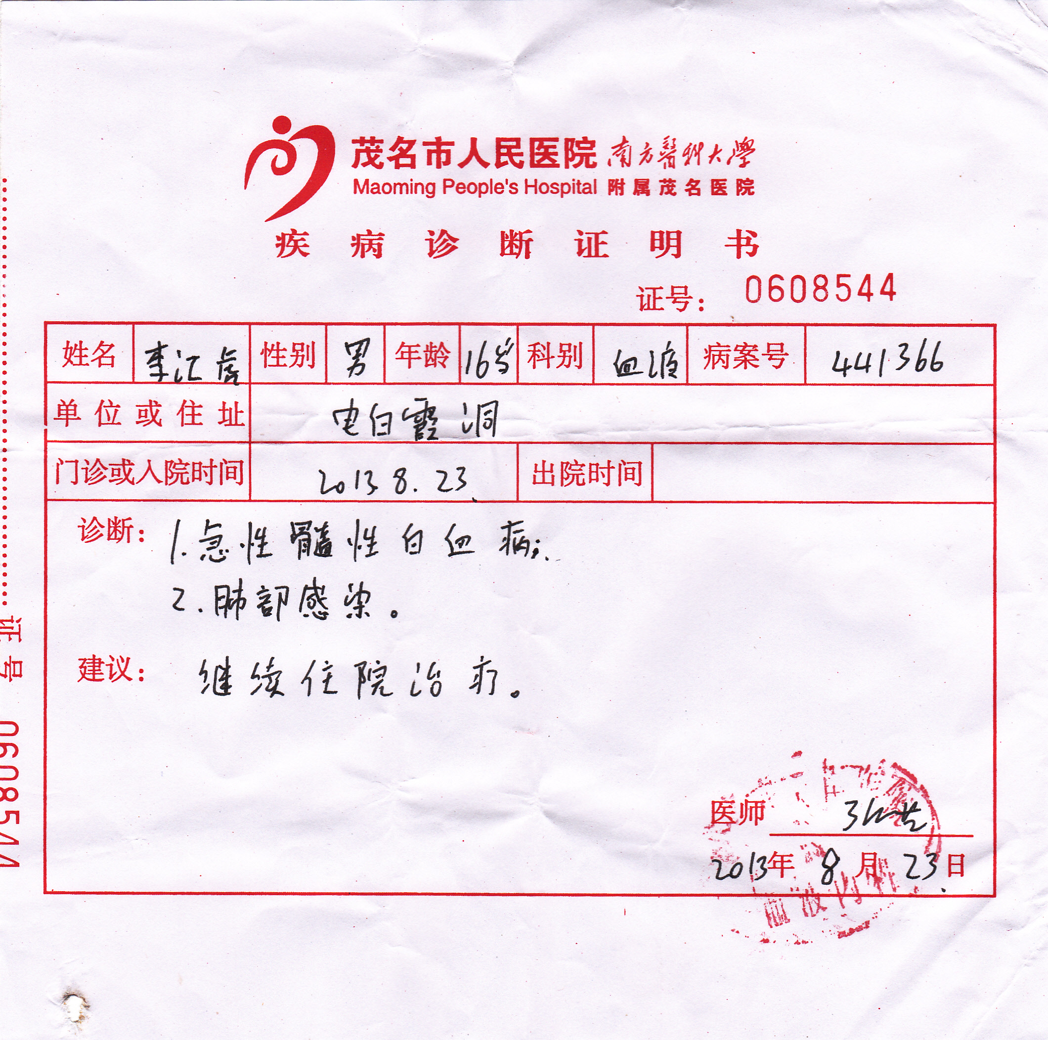 李江虎,电白县霞洞镇下岭高车村人,电白第三中学初三(8)班学生。一个月前被诊断出患急性白血病,现留医于茂名人民医院6号搂6层血液科5号床。目前病情危重,正在抢救治疗。李家父母均为农民,靠打短工维持生计,收入极不稳定,日子可谓艰难。现在,白血病这座大山更是将李家压得风雨飘摇……