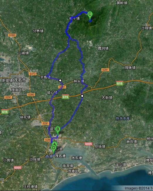 活动安排:3月8日星期六早上7:40-8:00在电白客运中心站集合(地图B点),8:00准时出发,过时不候!行程首先从水林路经林头/霞洞化普进根子,在根子墟汇合茂名市区网友尝地方美食,然后再出发到浮山村委会平山田村看油菜花、游览冼太庙爬浮山岭,从浮山岭下撒后再视情况而安排聚餐(费用一般约30元/人以下,现场AA,也可自理),返程经羊角上七那线返水东,全程约110公里。