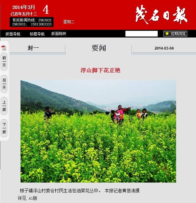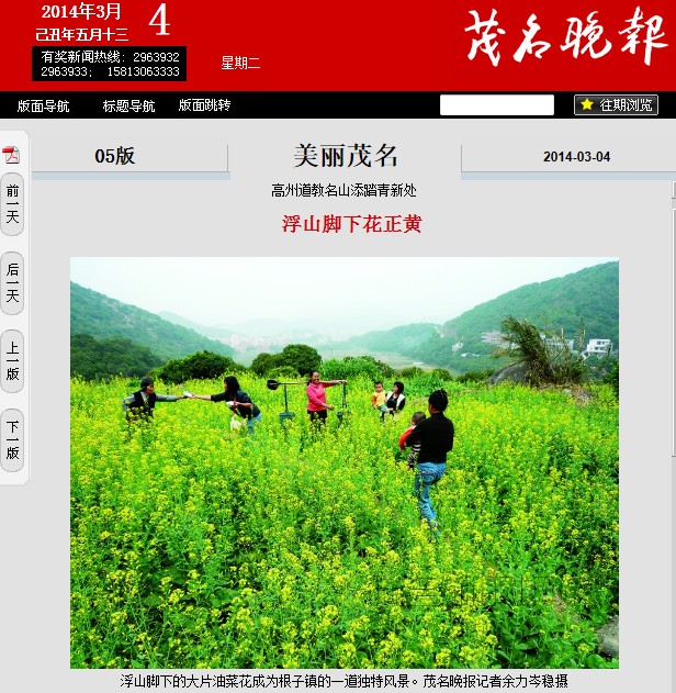 关于高州市根子镇浮山村委会平山田村的油菜花,昨天茂名日报/晚报都有报道