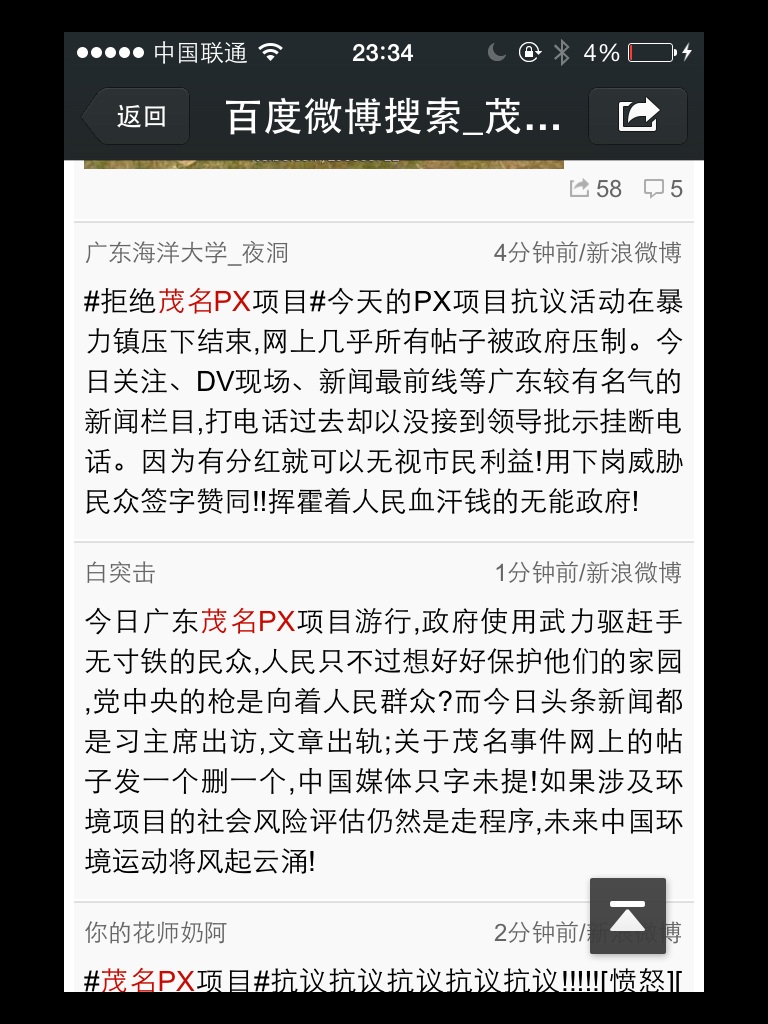 转发:事情再升级,今晚化州,高州,信宜的武警都会下来,今晚十二点开始大封闭,大家要注意安全!茂名人不要用命去硬来。现在的茂名就像关起大门,所有信息被封锁了。事情发展到烧警车,推翻政府车,防暴警见人就打就抓,听说已死亡两人,茂名人挺住!政府不把消息外露。今夜记挂着游行的勇敢市民,睡不着。
