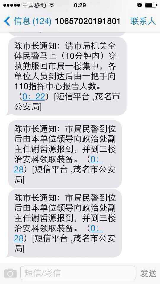 凌晨1点多的信息:化州10台大巴武警已到位,现场烧警车射大水喉,开始执行抓捕,各位有亲朋在市委附近的请相互通知回避